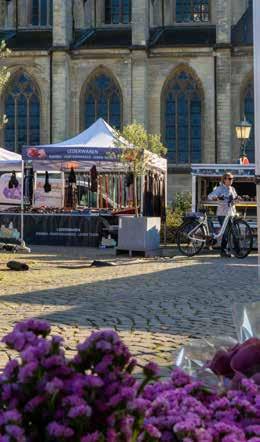 passanten van heinde en ver. Gezelligheid en altijd druk op en rondom het plein, aan de marktkramen maar ook in de cafés en restaurants voor een zak friet of verse vis, sjieke stoffen en naaigarnituren, bloemen en kaas, maar zeker ook voor verse groenten en fruit.