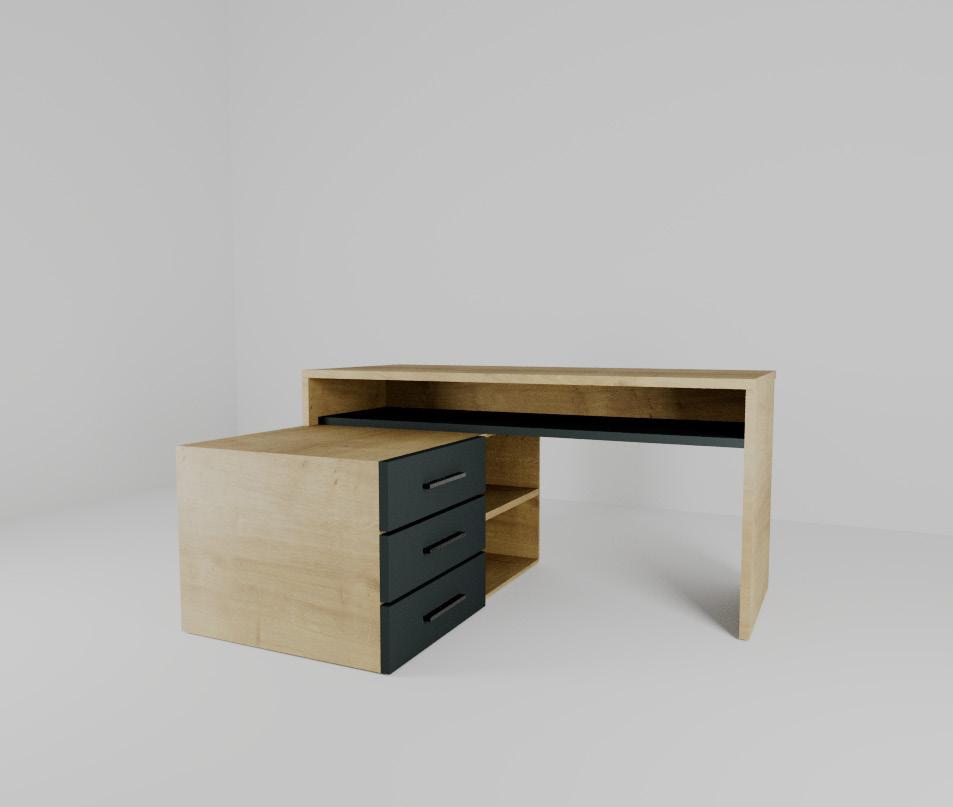 As for the rendering I used 3Ds Max, added the materials. The surface and sides, as well as the shelves on the left side of the desk, are made of knotty oak veneer. The desk drawers and the lower shelf are both covered with a dark veneer.