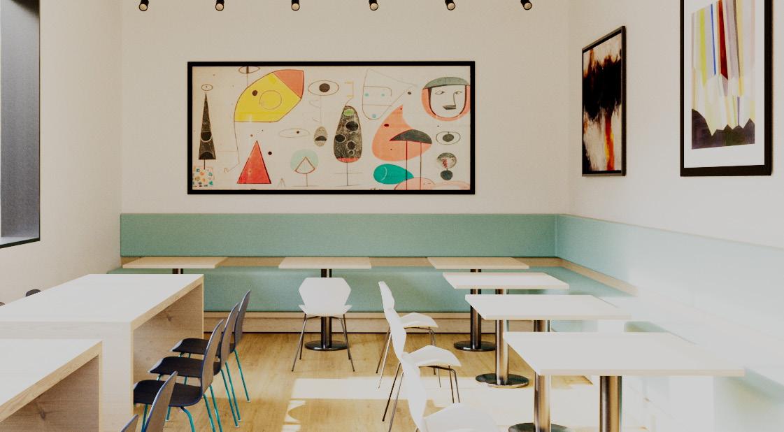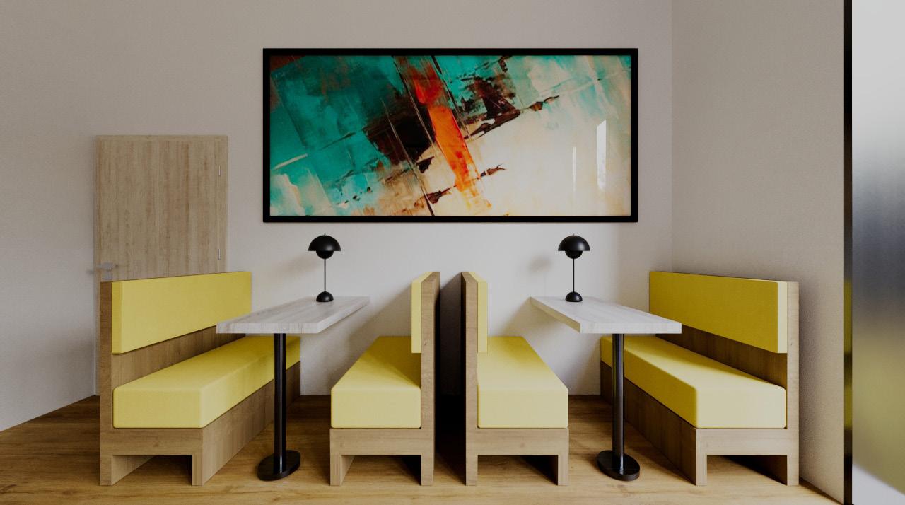 The long communal tables encourage teamwork and productive exchange, while smaller seating areas provide retreats for focused work or meetings. A continuous, upholstered bench along the wall ensures maximum comfort and flexible usage options. Light wood elements combined with soft pastel tones create a calm and motivating atmosphere. Abstract artworks add creative accents and stimulate inspiration. Large windows allow plenty of natural light to enter, enhancing the open and spacious feel of the room.