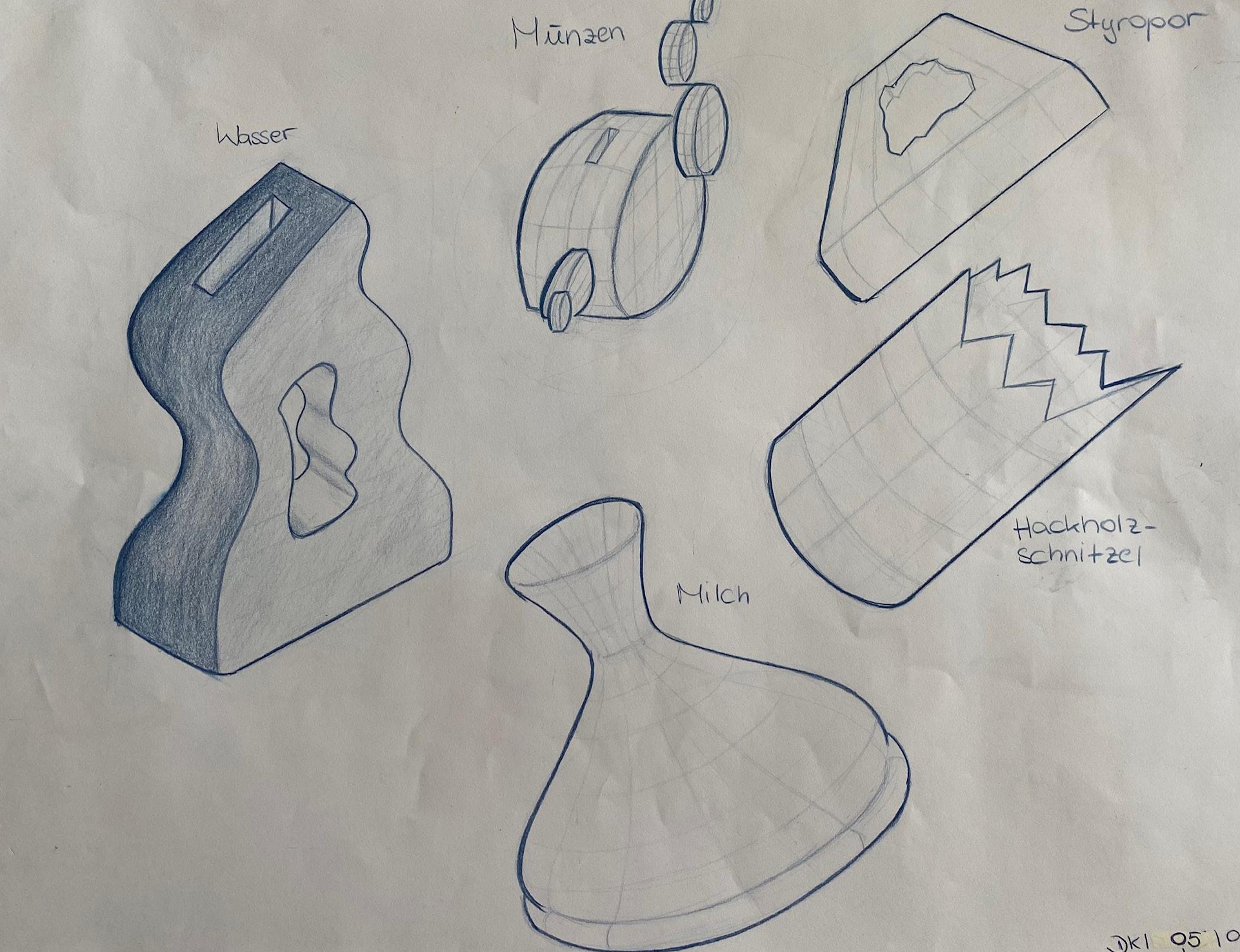 These sketches were made during the first industrial design project. The task was to design the task was to design vessels that reflect the design language of a specific liquid or material. In my case it was water, milk, styrofoam, wood chips and coins. Furthermore, i had to make a prototype of the chosen vessel, which was a vessel for water.