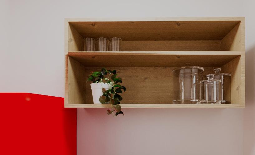 The kitchen is equipped with a modern, black sink and matching faucet, integrated into a simple countertop. Above this, an open, wood-paneled shelf provides practical storage space for dishes and kitchen utensils, as well as room for decorative items like small plants.