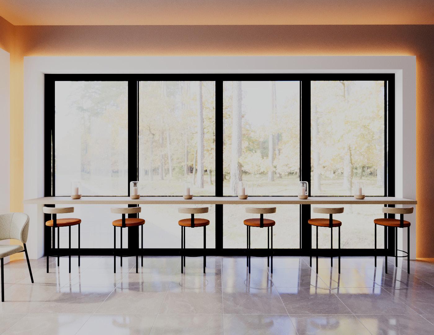 The café bar has a long, narrow high table positioned in front of a large window. Instead of being supported by its own legs, the table is held up by the window frames, creating a sleek and seamless look. The room design relies on natural light sources through the large windows, which provide a wonderful view of the municipality of Kuchl.