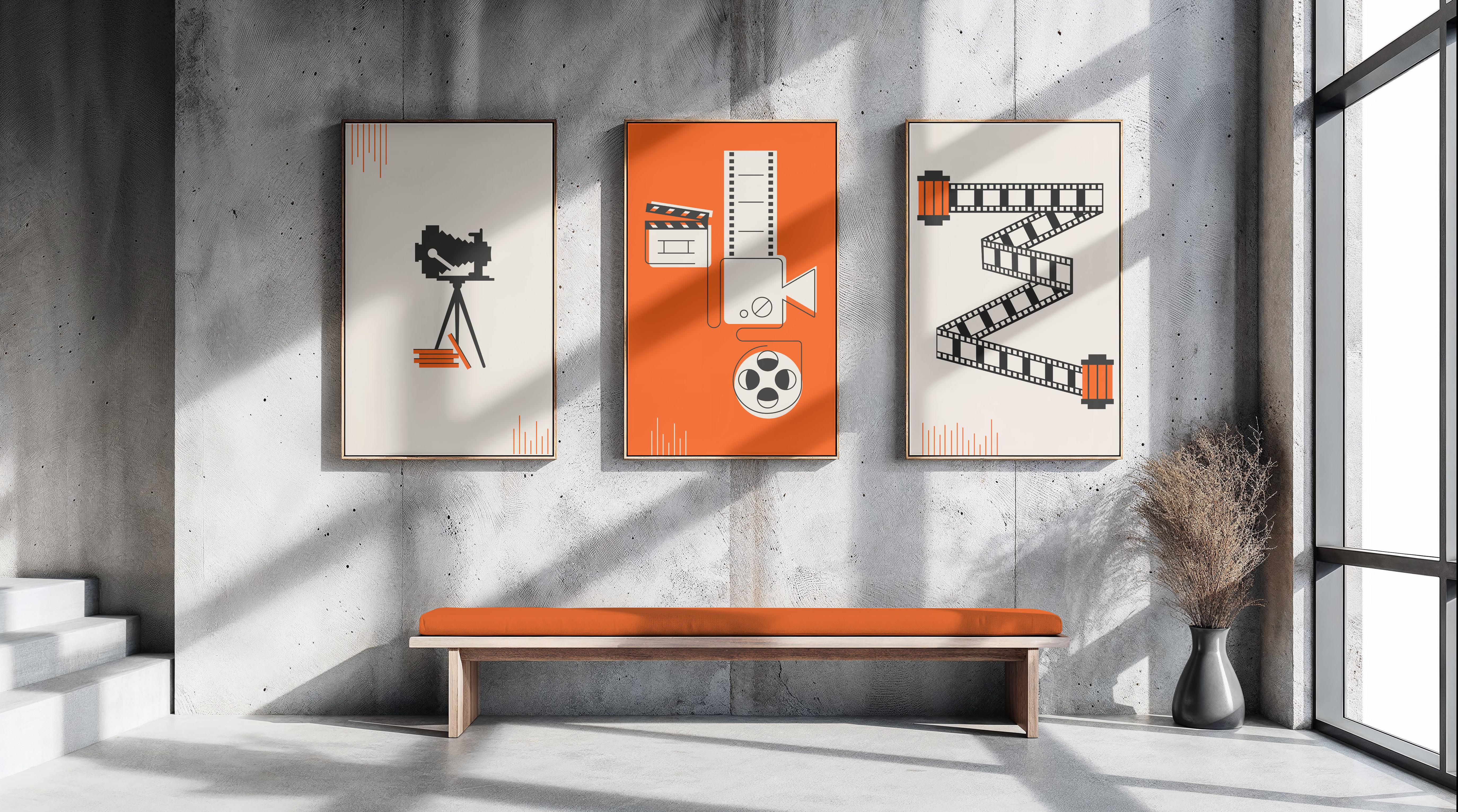 The second series of my art prints should symbolize life graphically. The first picture shows the first camera, figuratively representing the first moments in life. The second picture depicts the different moments one experiences in life, in the spirit of ‚Cut, Camera, Action.‘ The last picture shows film reels. Film reels store individual frames that play an entire movie; therefore, life is a collection of countless frames that play out life.