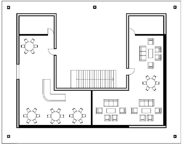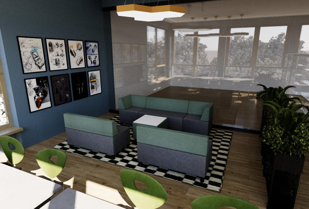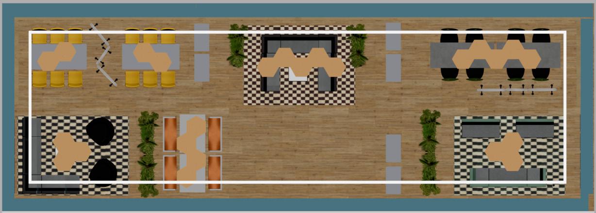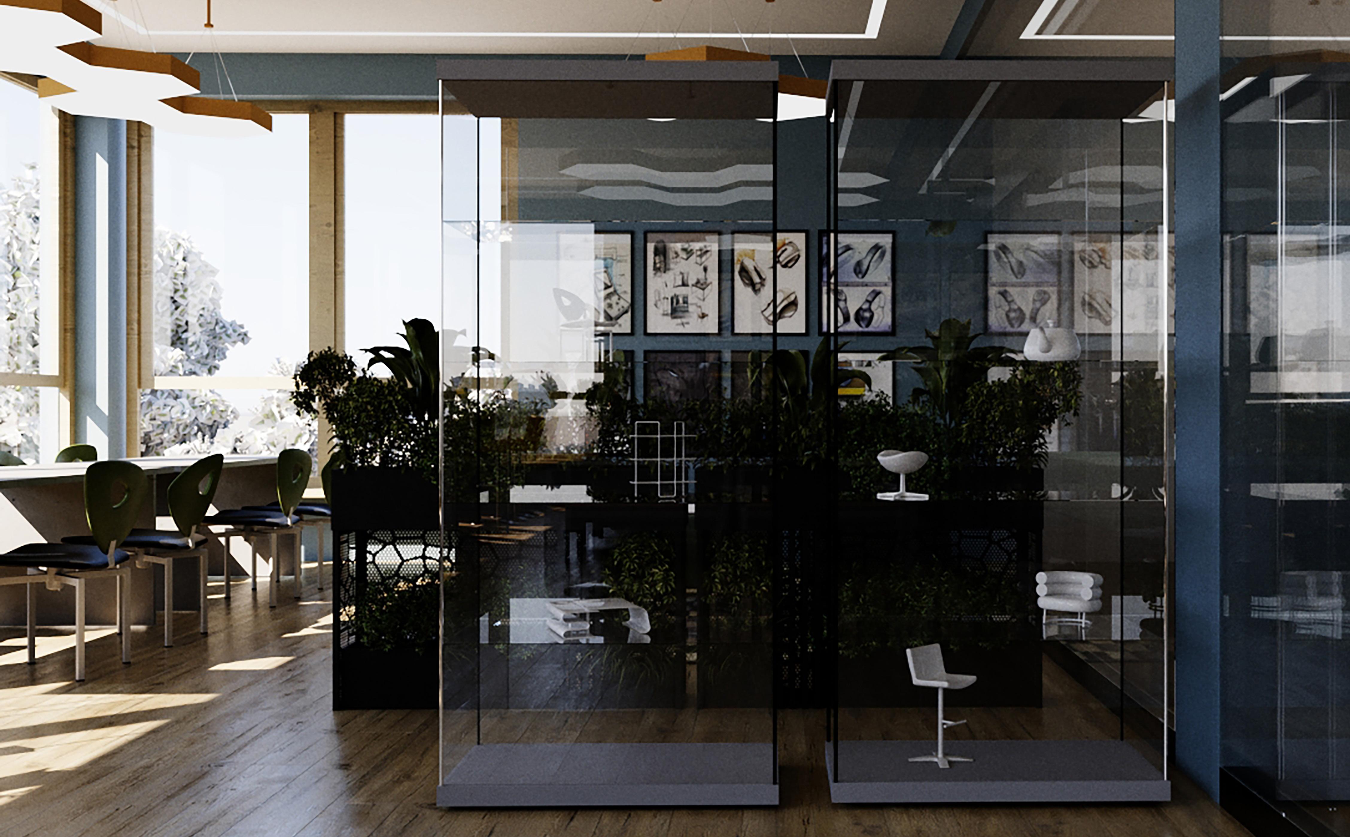 The „Creative Room“ is accessed through a glass door located in the middle of a glass wall, which is positioned at the pillars, separating the upper part of the cafeteria from the rest of the activities. The room is fully designed for creative and productive work, featuring numerous well-thought-out design elements.