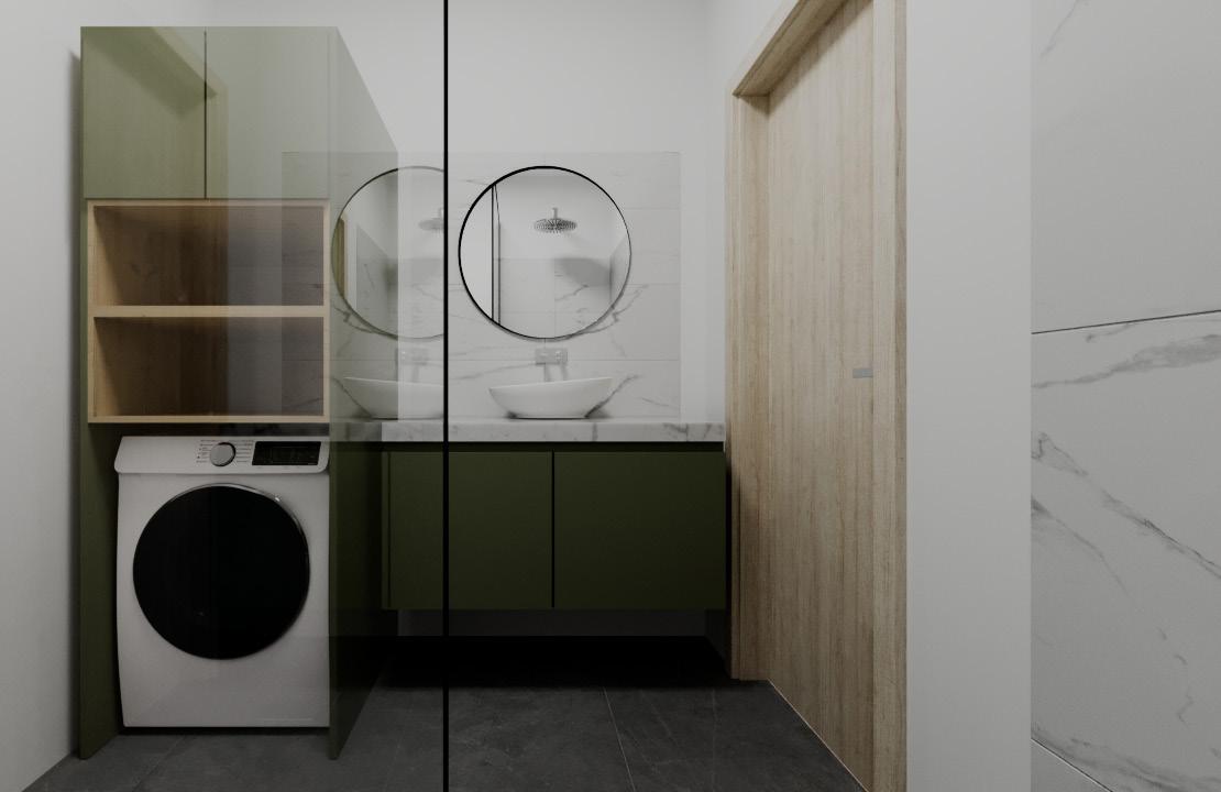 The bathroom is modern and efficiently designed within a space of 4 square meters. The color palette is subdued, combining shades of green, white, and gray to create a calming atmosphere. The smooth surfaces and the use of large marble tiles on the walls give the room an elegant and tidy appearance.