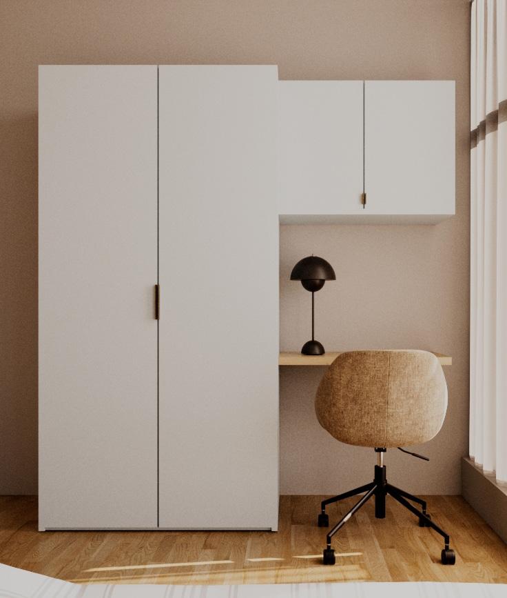 The first image shows a minimally designed workspace. The room is kept in neutral tones, with a simple bright grey wall. On the left side, there‘s a large, pastel blue cabinet that reaches up to the ceiling, providing ample storage space. On the right side of the room, a floating wooded shelf is mounted above a chic desk chair made of brown fabric with a black metal base. A simple black desk lamp provides lighting. Large windows ensure plenty of natural light and are adorned with light, transparent curtains.