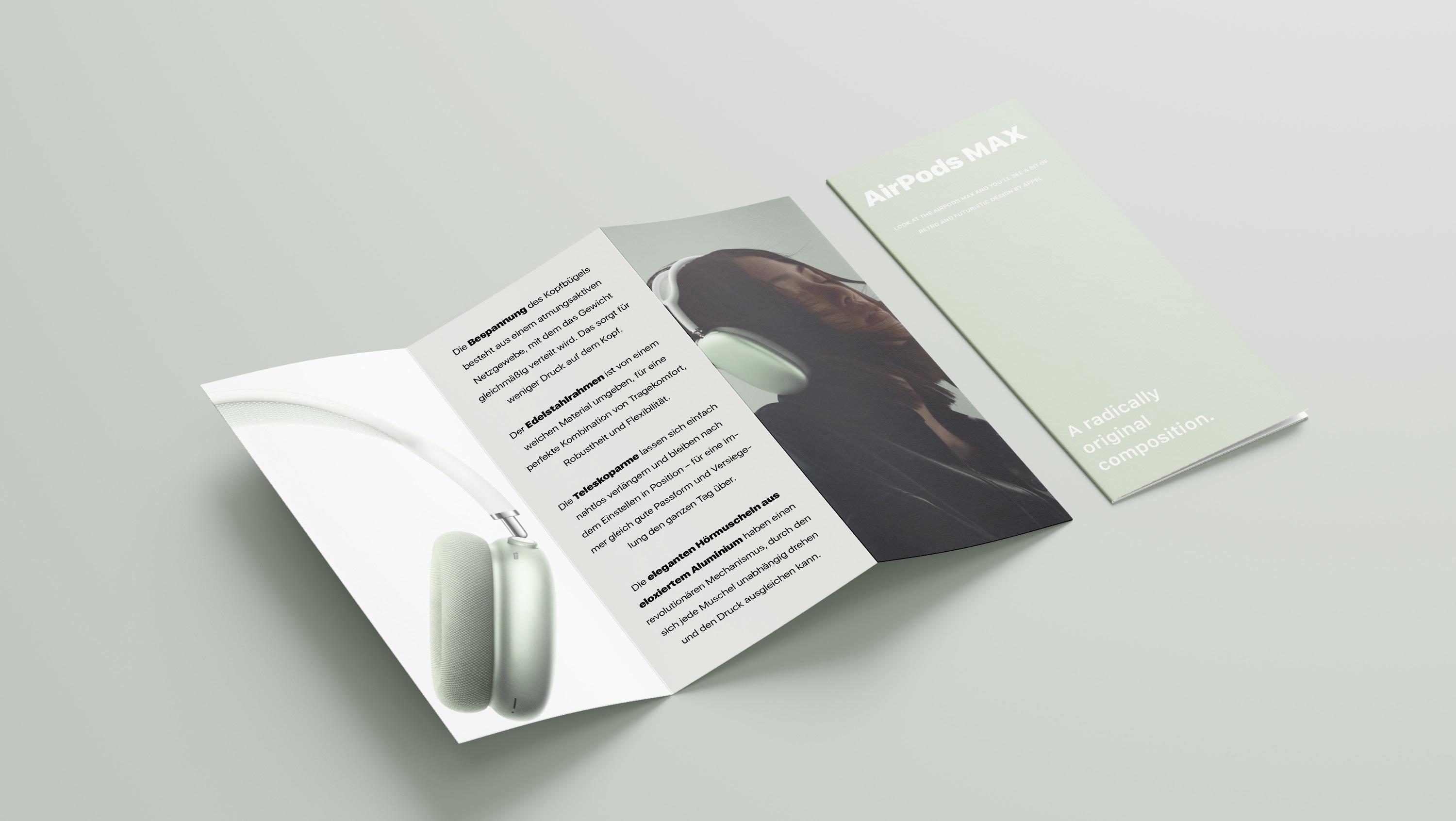 As part of the graphic design class, we had to design a flyer. The flyer had to be from a specific company and the task was to reflect the corporate design. In my case, I chose Apple and designed a flyer for the Airpod Max.