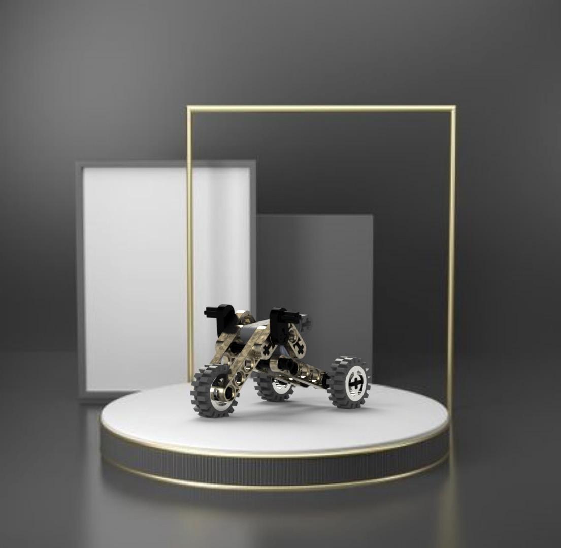 The idea behind the first rendering was to present the Lego trike in the way new cars are presented. It is displayed on an illuminated podium, with a simple background so as not to attract too much attention. The color scheme of the trike is also kept simple, with several golden accents and black steering