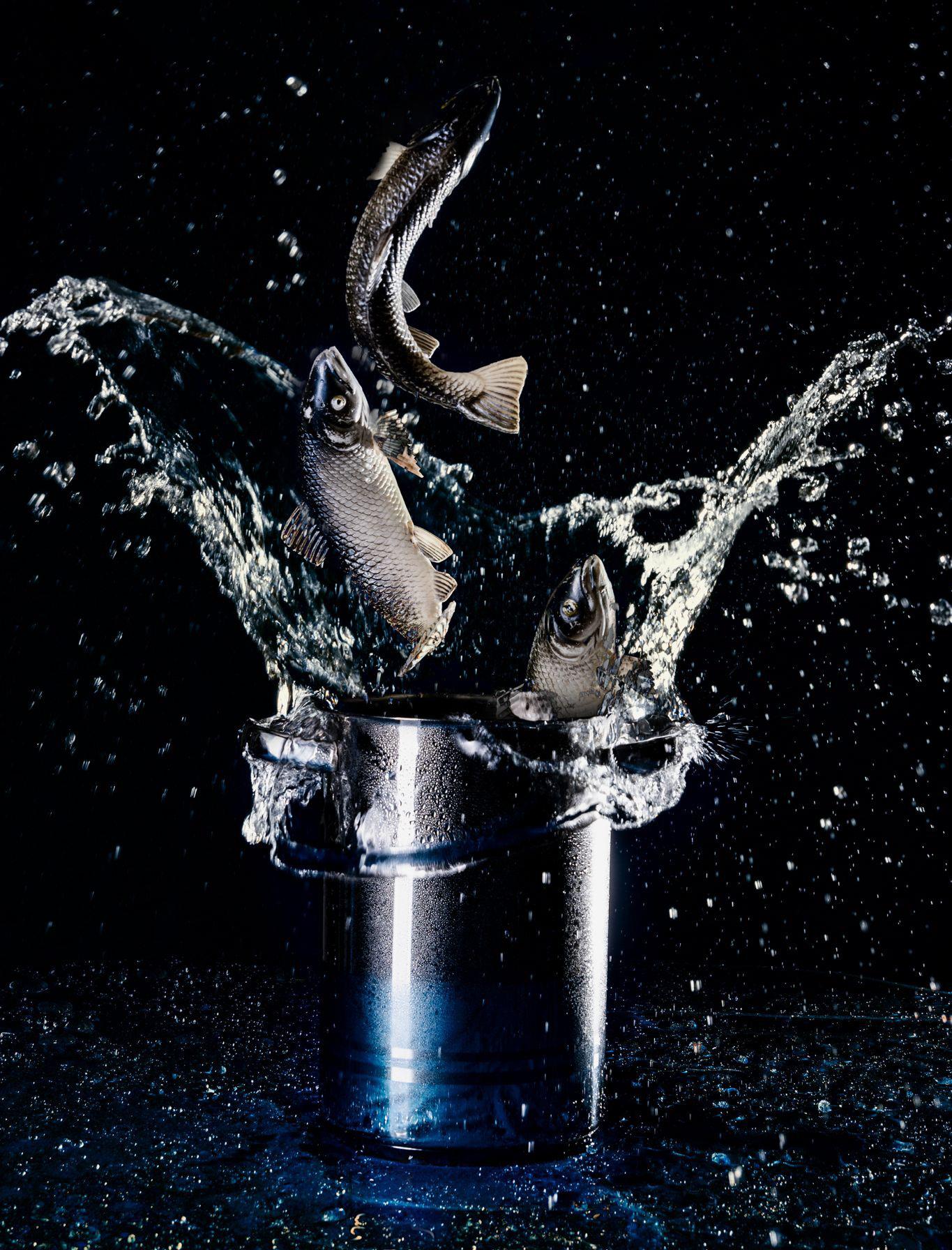 In the 6th semester of the photography course, we had to complete various small projects. One of these projects involved taking a photo based on a sketch. The sketch depicted fish jumping out of a bucket, and we had to recreate this photo as a group. First, we photographed just the fish and the bucket. Then, we threw stones into the bucket to create water splashes. In Photoshop, we combined both photos, resulting in the image you see on the right.