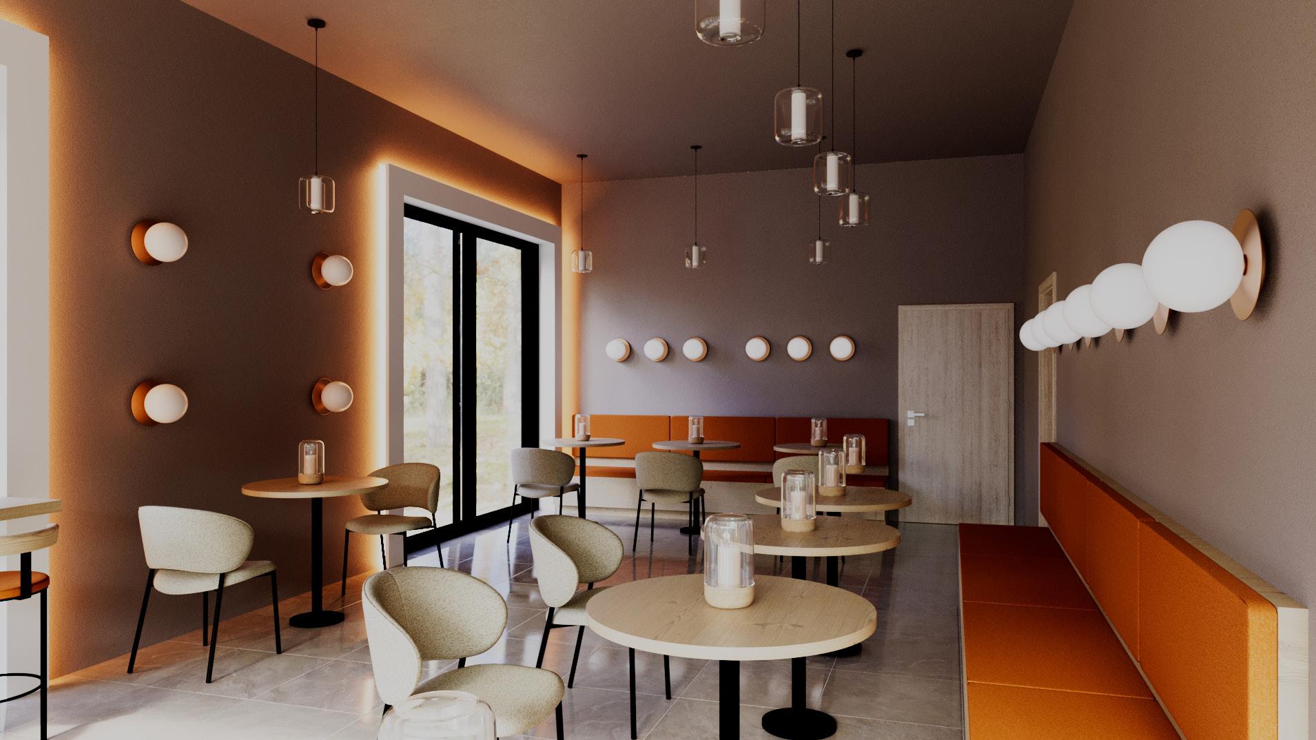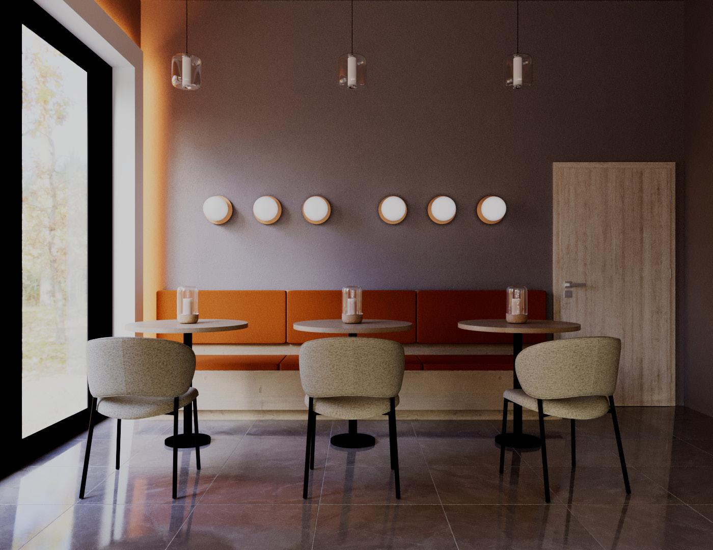 A long, upholstered bench in a warm orange tone runs along the wall. It is mounted on a wooden base, creating a natural and stylish look. Three round wooden tables with sleek black metal legs are positioned in front of the bench. They are accompanied by three comfortable chairs with light beige fabric upholstery and black metal legs. Six round wall lamps are mounted on the wall, providing soft, diffused lighting. Three elegant pendant lights with glass cylinders hang from the ceiling, adding stylish lighting accents.