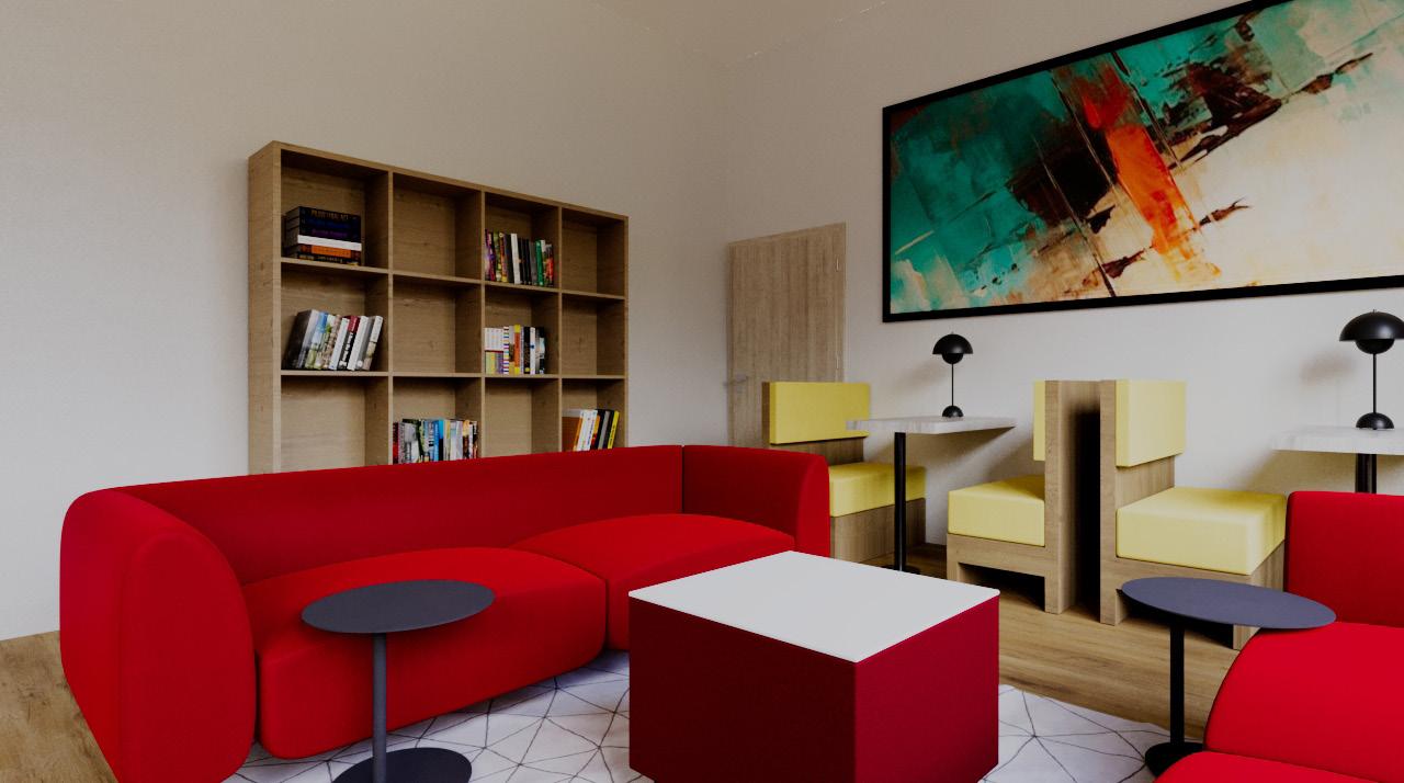 The yellow seating booths provide quiet individual workspaces with an ergonomic design. The red sofa area invites flexible work, meetings, or creative sessions. An open bookshelf with books, magazines, and newspapers fosters knowledge exchange and inspiration. Warm wood elements and bold color accents create a productive atmosphere. Modern details and an abstract wall painting add creative touches. The thoughtful design supports both concentrated work and informal interaction.