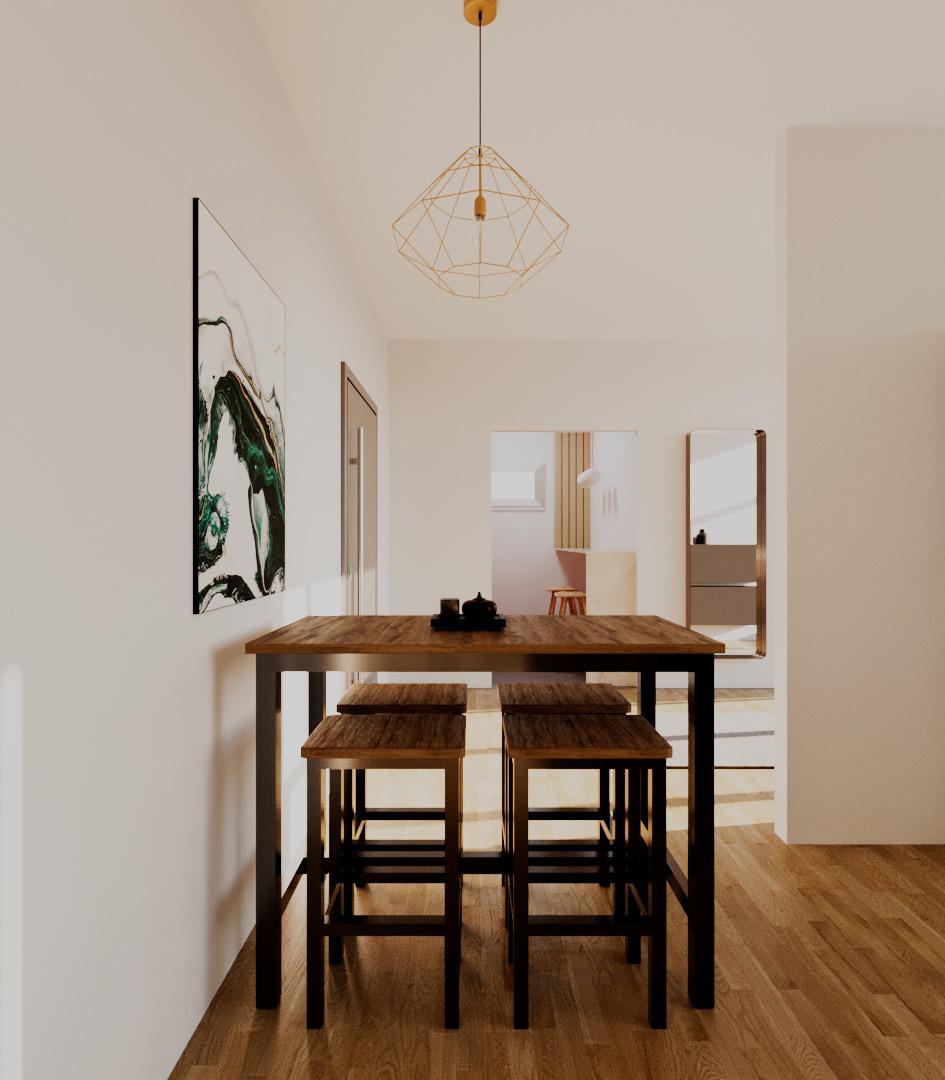 The dining area is modern and simply styled. A large, dark wooden table stands at the center, surrounded by four matching stools that add a simple yet elegant touch. Above the table hangs a striking, geometric pendant light in gold, which gives the room a modern, design-oriented atmosphere. On the left wall, there is a large, abstract artwork with bold green and black shades, providing a dynamic contrast to the otherwise neutral wall colors. The room is bright, filled with natural light, and conveys an open, inviting feeling.