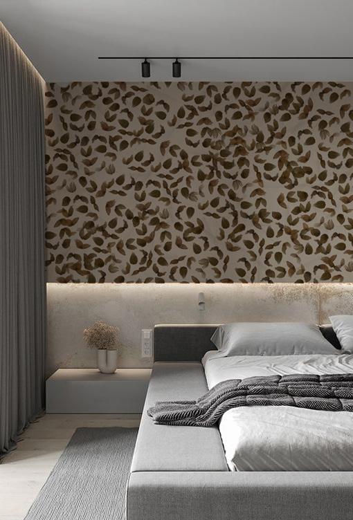 The subtle indirect lighting on the ceiling creates a cozy atmosphere, while the beige-brown wall color makes the space feel pleasantly warm. Small decorative elements such as candles and a glass carafe are placed on the tabletop, adding to the stylish and inviting ambiance