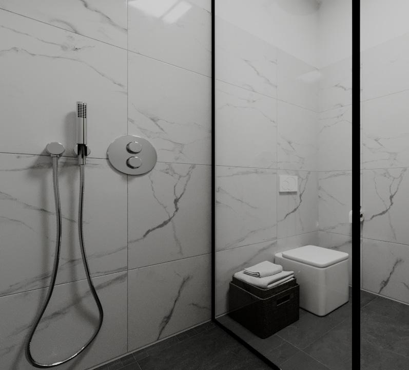 In the first view, the washing area is smartly placed next to a built-in cabinet that offers both shelving and space for a washing machine. The sink area is equipped with a modern, round mirror and a simple yet stylish faucet. The second view reveals the shower and toilet, separated by a glass wall. The shower is fitted with a handheld showerhead, and the toilet is a floor-standing model with a push-button flush mounted above it. The use of marble tiles continues here, maintaining a visual consistency throughout the bathroom. The functional design and choice of materials make this bathroom not only visually appealing but also practical and easy to maintain