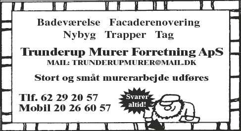 December 2022 13 Kloakarbejde - Gravning Minigraver Entreprenør & Aut. Kloakmester Mobiltlf. Martin 4033 8039 · Kurt 4016 3031 KURT FRANDSEN & SØN A/S Mobil 20 40 41 70 Oure Oliven Oliven · Oliventapenade Balsamico · Olivenolie Hudplejeserien Olive Aloe Ullemose frugt V/ Jesper & Anne Mette Ullemose Hovvej 7 - 5883 Oure 3031 2324 - ullemosefrugt@gmail.com www.ullemosefrugt.dk Selvbetjeningsbod åbent alle dage fra kl. 06.30 til 23.00 VÆRKSTEDER FRISØR VELVÆRE PRODUKTSALG FORSAMLINGSHUS ANNONCE PLADS TIL SALG Kontakt Pia Skovshoved Tlf. 24 63 81 83 NEM-klip Din hjemmefrisør v/ Annemette Schütt-Beck Mail: nemklip@gmail.com 5884 Gudme Tlf.nr: 92 14 12 14 ERHVERV - HÅNDVÆRK OG SERVICE Trunderup Murerforretning ApS Mail: trunderupmurer@mail.dk Falledvej 21, 5874 Hesselager Stort og småt murerarbejde udføres Salon Lykkesminde logo-2.pdf 30.03.2022 19.00 Kirkevej 32 · 5892 Gudbjerg tlf 9397 9778 www.salonlykkesminde.dk Frisør, exstensions, negletekniker og PMUartist BOOK ONLINE Vibeke Kunkel Biodynamisk KST - RAB Qigong Instruktør Ny Livs Energi ApS Solvænget 5, 5883 Oure Mobil 2277 6353 vibeke@nylivsenergi.dk www.nylivsenergi.dk SoulKey- og Kropsterapi - Detox - Healing Økologiske ænder Andtiljul.dk Gårdbutikken har åbent hver weekend fra 12-15 og mandag aften fra 17-18 Åbent fra d. 22. oktober Bøsørevej 40 · 5874 Hesselager Tlf. 40 31 77 16 Gudmekongens Land