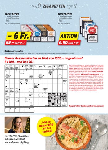 Denner Geschenkkarten im Wert von 1000.– zu gewinnen! 5 x 100.– und 10 x 50.– Alle Teilnehmenden aus der Schweiz und aus dem Fürstentum Liechtenstein können Denner Geschenkkarten im Gesamtwert von CHF 1000.– gewinnen, wenn sie a) das Lösungswort in den nummerierten Feldern auf eine Postkarte schreiben (mit genauem Absender) und an diese Anschrift senden: Denner Wettbewerb, Postfach, 8706 Meilen; b) das Lösungswort unter folgender Internetadresse eingeben: www.denner.ch/kreuzwortraetsel; c) auf unser Rätsel-Phone anrufen (Gebühr Festnetz: CHF 0.95 pro Anruf): 0901/33 66 37. Teilnahmeschluss ist der 27.11.2017. Die Gewinner/innen werden unter den Teilnehmenden mit dem richtigen Lösungswort ausgelost. Sie werden spätestens bis zum Ende des Folgemonats schriftlich benachrichtigt und geben ihr Einverständnis für die Veröffentlichung ihres Namens und Wohnorts auf der Website der Denner AG. Der Rechtsweg ist ausgeschlossen. Über den Wettbewerb wird keine Korrespondenz geführt. Mitarbeitende der Denner AG sowie aller Unternehmen, die an diesem Heft mitwirken, und deren Angehörige sind von der Teilnahme ausgeschlossen.