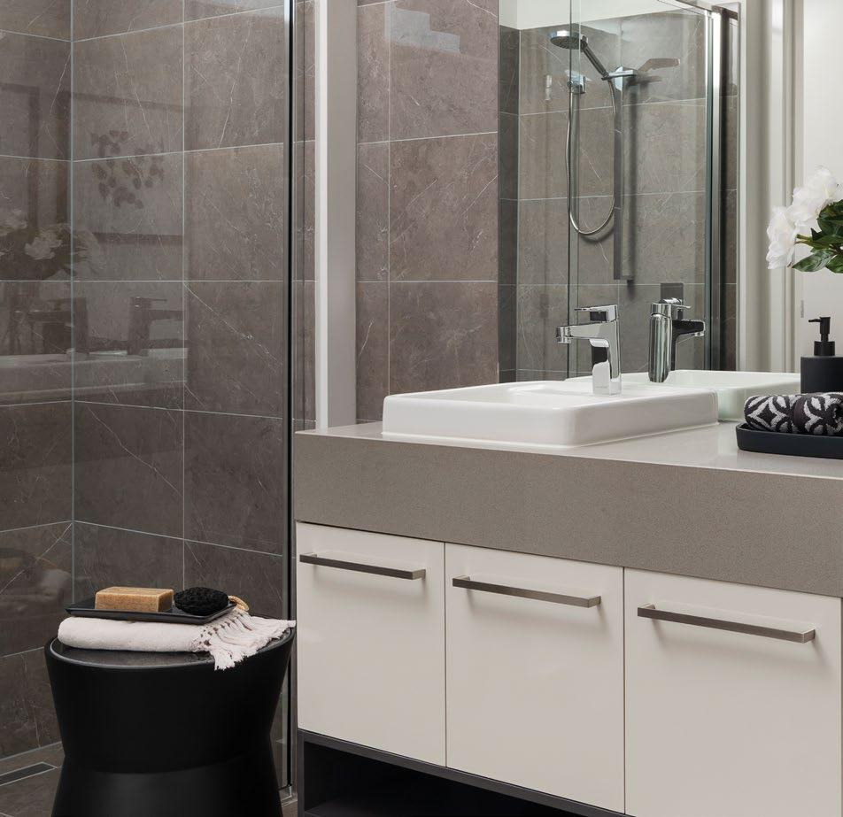 20mm or 40mm edging to Caesarstone ® benchtop from DFH Series 1 and 2 to ensuite (note: Caesarstone® thickness is specific to vanity style selected. Vanity style 2 includes laminate benchtop and surrounds only).