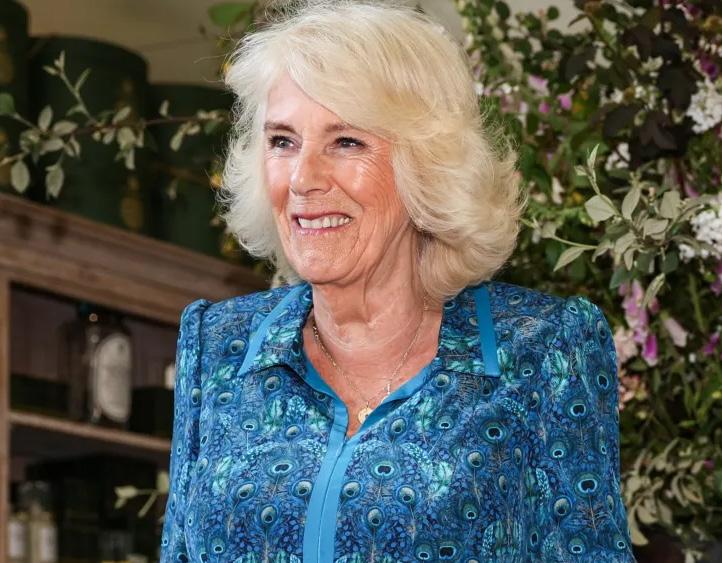 For the occasion, the queen consort repurposed a peacock print dress by Fiona Clare.