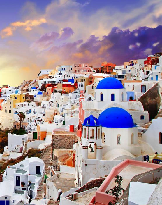antorini is one of the Cyclades is ands in the Aegean Sea. Back in 1450 BC, a massive volcanic eruption caused the middle of the isle to collapse. It left a steep-edged crater known as a caldera peeping above the waves, which today is a spectacular sight from the island’s clifftops. Greece’s hot weather means a long summer season during which to enjoy the views. The whitewashed, cubiform houses of its 2 principal towns, Fira and Oia, cling to cliffs above an underwater caldera (crater). They overlook the sea, small islands to the west and beaches made up of black, red and white lava pebbles.