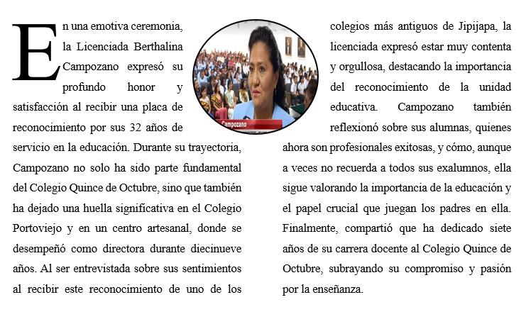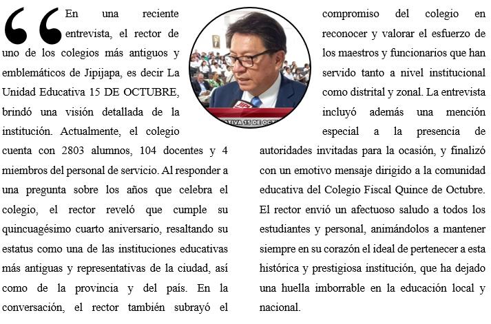 Por el aniversario de creación institucional de la unidad educativa fiscal “Quince de Octubre”, el 31 de mayo, en el salón de la ciudad, se efectuó la sesión conmemorativa, entregándose menciones y reconocimiento a los mejores estudiantes, docentes, jubilado e intervenciones de sus representantes