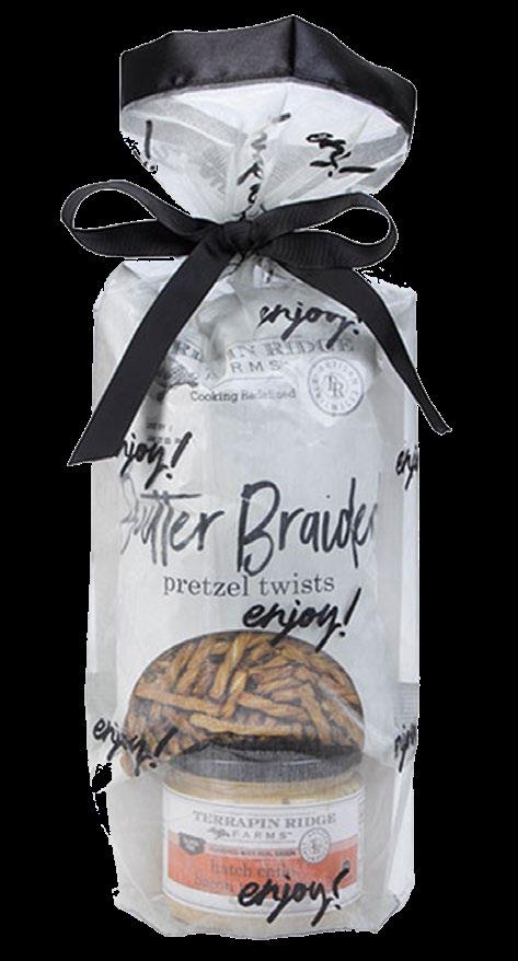 Decorated Gift Bag with 1 Bag of Pretzels or 1 Box of Crackers and 1 Jar of Dip, Jam, or Mustard. Bagged and ready to give as is!