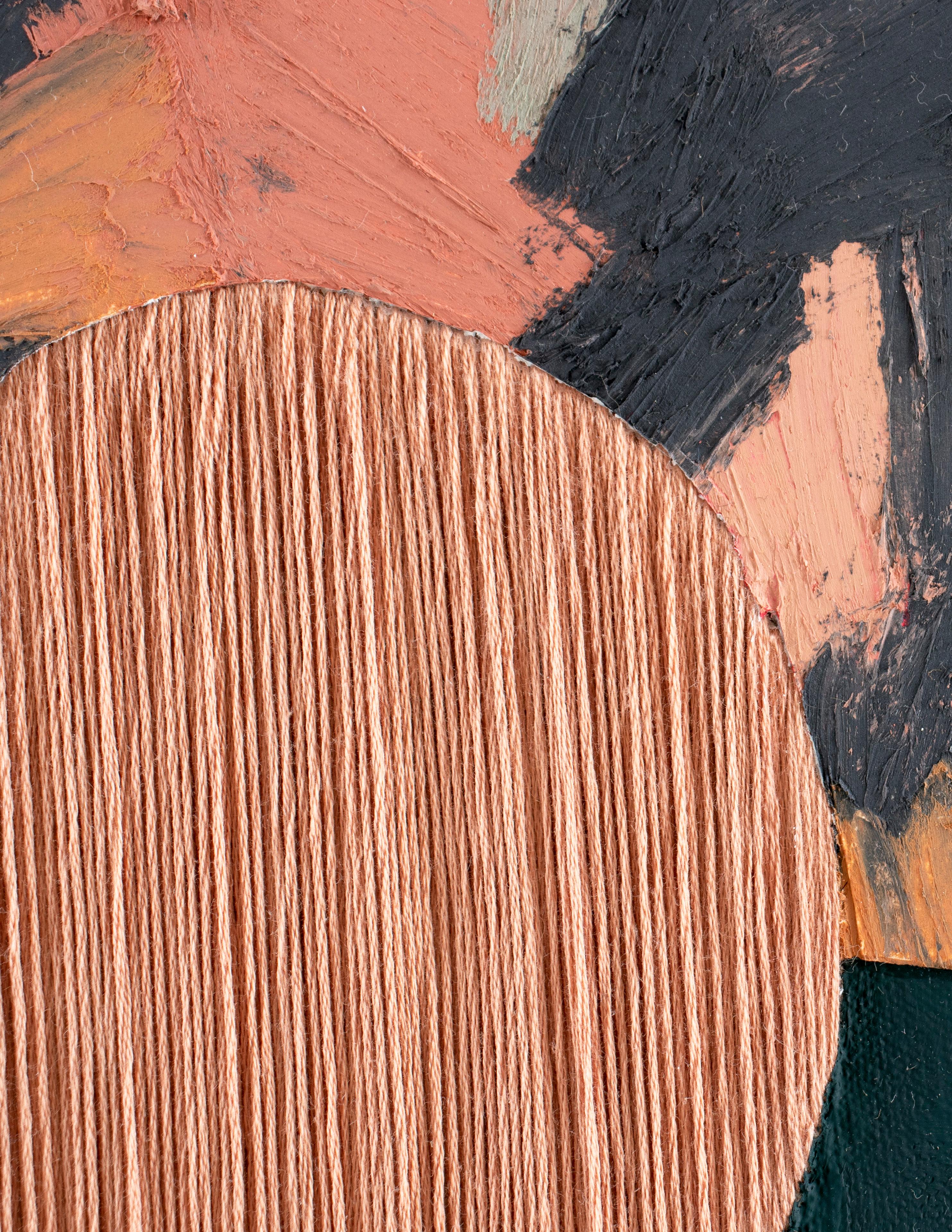 intellectually, learning about other modern and contemporary feminist art and textile practices. She read Briony Fer’s book On Abstract Art and was fascinated with the chapter “Bordering on Blank: Eva Hesse and Minimalism,”10 explaining that what interested her was how the work exemplified “the moment where psychology entered minimalism.”11 Around this time, Valdez also started experimenting with embroidery after discovering some sewing materials in a box when her mother was moving houses. She brought the thread into her studio and started thinking about using it as a form of drawn line in her paintings, at first exploring what would happen if she wrapped it around her stretcher bars like Eva Hesse did with cloth in Hang Up (1966), but then settled on keeping the thread within the frame.12
