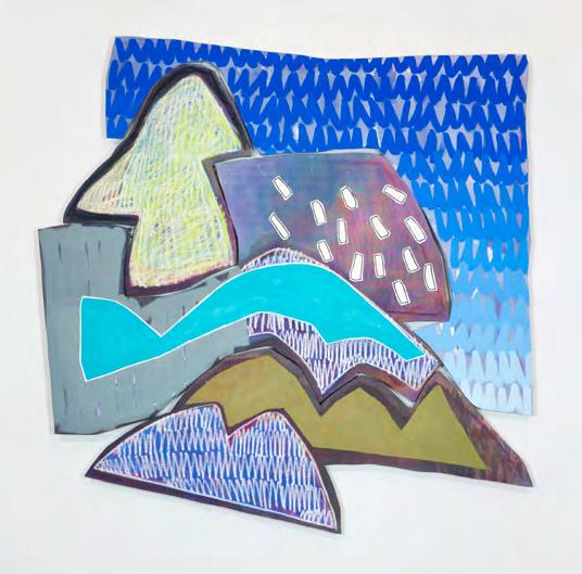 This theatrical environment is made even more evident in Hill’s Backdrop series where multi-panels dance within a painted proscenium of unstretched canvas. These works bridge into the field of installation where painted elements toss and tumble in a canyon of color and even touch the floor. Backdrop 3 features Hills’ figure painted blue in the foreground while a fiery orange shape acts as a sunset offsetting a jagged mountainous horizon.