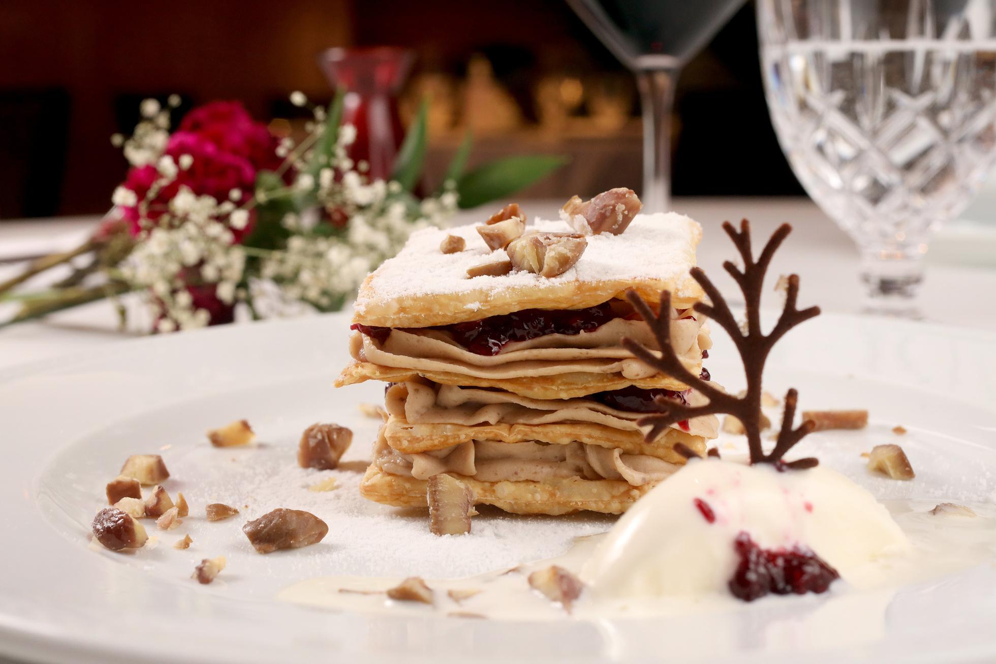 Mil folhas de castanhas portuguesas e geleia de frutas vermelhas ao vinho do Porto.