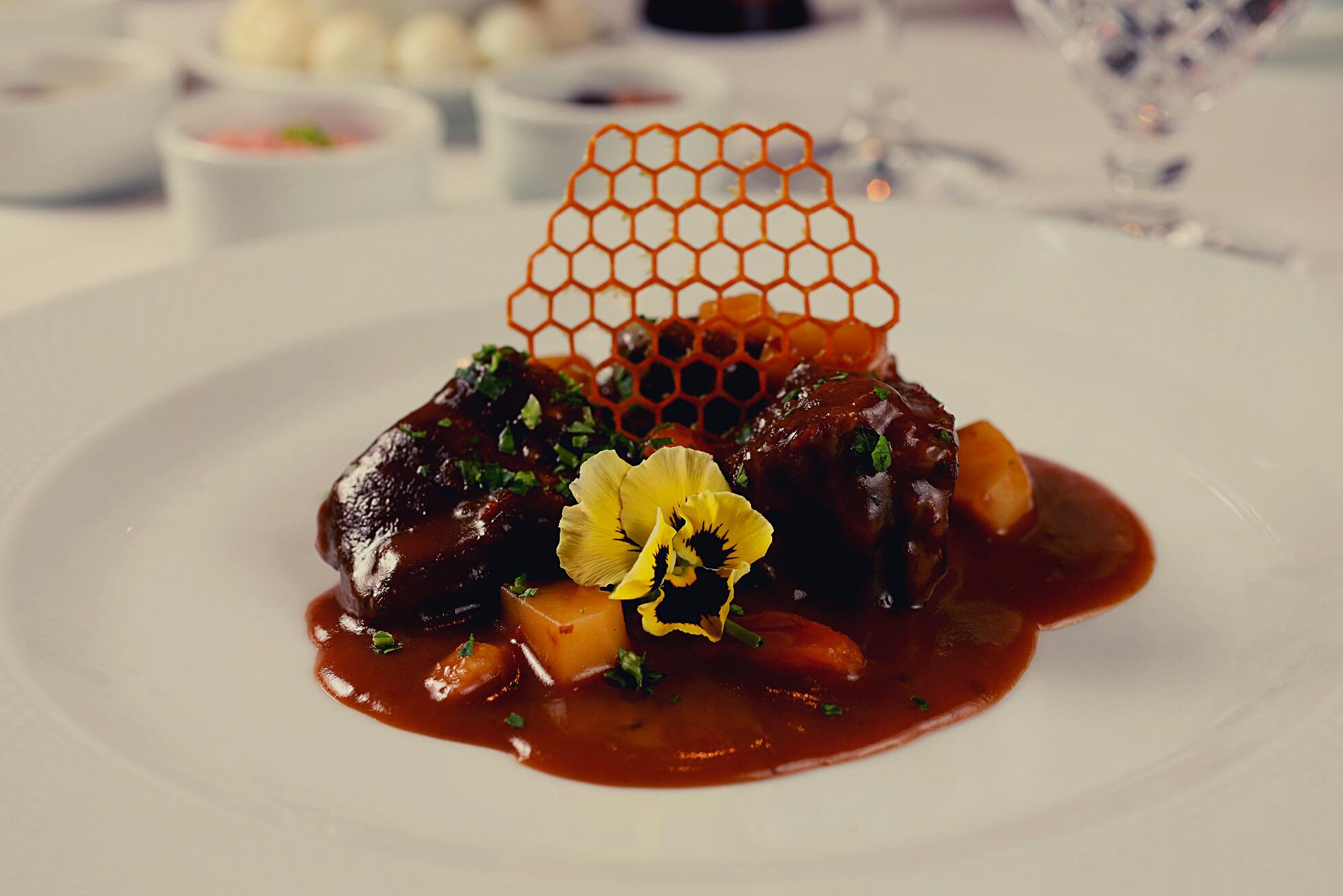 Bacalhau cozido com purê de brócolis trufado e creme de bacalhau por cima da posta e Bochechas de Vitela com damasco