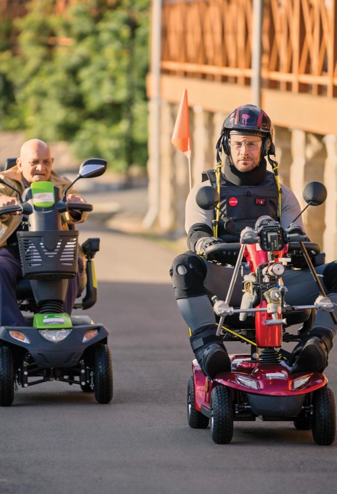 11. Using an “age simulation suit,” Hemworth reflects on the impact of an aging body, even taking some time out to test a mobility scooter with a friend.