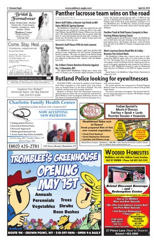The Middlebury College menÕ s lacrosse team won its sixthconsecutive NESCAC game with a 12-6 road victory at Colby (6-7, 3-6). The Panthers (8-6, 6-3) have now won six of their last seven games overall. Jon Broome tied the school record with six assists in the game, equaling the mark earned by Pete Smith on March 24, 2009. Middlebury returned to action on Wednesday when they host ed Williams in the NESCAC regular season finale. Special thanks to the Middlebury College Athletic Department for college sports news.