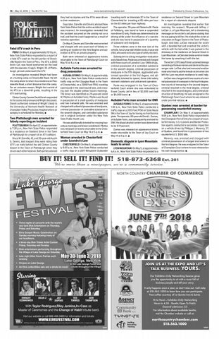 they had no injuries and the ATVs were driven to their residences. Days later, Danville and Devins advised New York State Police that the entire accident report was incorrect. An investigation revealed that the accident occurred on the airstrip not on a trail, and that the crash happened as a result of reckless operation. On May 4, Devins and Danville were arrested and charged with one count each of falsely reporting an incident in the third degree and operation of ATVs on private property. Both were released on appearance tickets returnable to the Town of Plattsburgh Court on May 10 at 4 p.m. ■