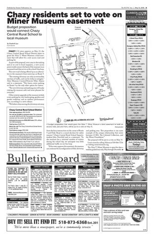 and parking area. This proposition is one more example of the unique relationship that exists between CCRS, The Colonial Collection, and the Miner Foundation.” The proposal will be put to a vote on May 15. Learn more by calling Adams at 518-846-7336 or visiting minermuseum.org. The Alice T. Miner Museum is open five days a week by guided tour only, May through December. ■