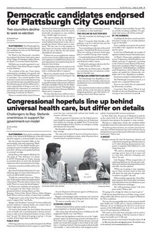 PLATTSBURGH | Each of the candidates seeking to take on Rep. Elise Stefanik (R-Willsboro) in this fall’s midterm ‘A BRIDGE’ elections supports a universal health care system. Boyajian stressed the need for bipartisan solutions and But the political hopefuls differ on the called for lowering the age of Medicare buy-in precise details, with some supporting “Medito 55 while allowing pharmaceutical comcare for All,” U.S. Sen. Bernie Sanders’ propanies to negotiate with Medicare to curb posed government-run health care legislation, rising drug costs. and others offering a more gradual pathway “We need to ultimately get to universal to universal coverage. coverage and we have to do it smart and Emily Martz, who supports Medicare for in a way that’s reflective of keeping costs All, spoke of “Two Americas” at a forum down,” he said. at SUNY Plattsburgh on Friday, sharing Like Boyajian, Wilson stopped short of an anecdote about an uncle who developed endorsing Medicare for All and said candimelanoma which metastasized to his lungs. dates must push past ideological litmus tests Insurance covered most bills and he’s now and offer concrete solutions. in remission. “When are we going to stop campaignBut a friend’s husband delayed doctor’s visits ing on what everyone wants to hear and following signs of a heart attack because he talk about the steps that it’s going to take could not afford health insurance. to achieve our goals?” she said. “Finally she convinced him to go,” Martz Wilson said she supports Sen. Chris Mursaid. “At the intake window, he dropped dead of phy’s proposal that would allow businesses a heart attack. We’re the richest country in the and individuals to buy into Medicare as part world. There’s no reason that should happen.” All seven candidates seeking to unseat Rep. Elise Stefanik (R-Willsboro) are calling for of the Obamacare exchanges. Photo by Pete DeMola Six Democratic candidates are running for universal health care access. The “self-promoting system” will drive the nomination for New York’s 21st Conprices down, Wilson said. gressional District. Joining Martz are Don An even 50 percent of Americans approve of Obamacare, “It’s going to be a bridge for where we want to get to.” Boyajian, Tedra Cobb, Patrick Nelson, Dylan Ratigan, according to a November poll. Cobb did not attend the forum on Friday, citing a schedKatie Wilson and Lynn Kahn, a Green Party candidate. Ratigan acknowledged public sentiment and criticized uling conflict. But she has come out in support of Medicare “Single-payer is part of the Green Party platform and of the Democratic Party for not taking the lead on the issue. for All as a pathway. course I support that,” said Kahn. “It’s time to actually solve it,” he said. “For me, the non-negotiable that is that everyone should Ratigan said the phrase “universal” has been politicized, have health care,” Cobb said at a forum in Johnstown in ECONOMIC DRIVER and has endorsed a “national health care system” that inFebruary. “It can be Medicare for All. Or it can be an exIf elected, Patrick Nelson said he would co-sponsor comcludes single-payer among the options. pansion of the (Affordable Care Act). Or it can be Medi“It’s hard to find people who don’t believe that universal panion legislation to Sanders’ legislation. care to 50 and expansion of Medicaid. “The system that will work best for us is Medicare for All access to health care is something that is obvious and nec“We need to stick with those principles and we need to essary to take us from being base barbaric to base civiliza- single-payer health care,” said Nelson. stick with problem-solving so that the outcome is that evtion,” he said. “It’s where we’re going to end up — it’s just Nelson said the legislation would also act as the “single- eryone has health care,” Cobb said. a matter of how long it takes to get there.” greatest” aspect for galvanizing economic development in Democratic primary voters head to the polls on June 26. ■ New York’s 21st Congressional District because universal PUBLIC SPLIT — This story has been abridged for print. To read this story Following numerous unsuccessful attempts by the White health care would allow people to move freely in the work- in its entirety, visit suncommunitynews.com. place — breaking “job lock” that ties people to jobs for health House and the Republican-led Congress to repeal Obamcare benefits — and would relieve cash-strapped munici-