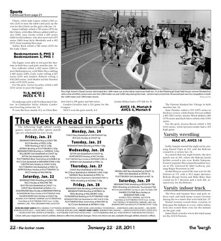 Beekmantown 8, PHS 2 Beekmantown 3, PHS 1 The Eagles were able to roll past the Hornets in both boys and girls matches Jan. 14. Eric LaBonte rolled a 682 series (248) to pace Beekmantown, with Mike Deyo adding a 660 series (245), Cody watts rolling a 621 series (219) and Andrew Roberts rolling a 618 (245) series. Josh Shaffer led the Hornets with a 672 (235) series. For the girls, Taylor Lavalley rolled a 645 (231) series to pace the Eagles. Peru High School’s Daniel Lennon dominated the 1,600-meter run at the indoor track event held Jan. 15 at the Plattsburgh State Field House. Lennon finished first with a time of 4:49.8. Lennon also won the 1,000-meter run and 3,200 relay during the meet. Lennon had a more than 30-second lead over his competitors in both the 1,600-meter and 1,000-meter events. Photo by Justin Prue