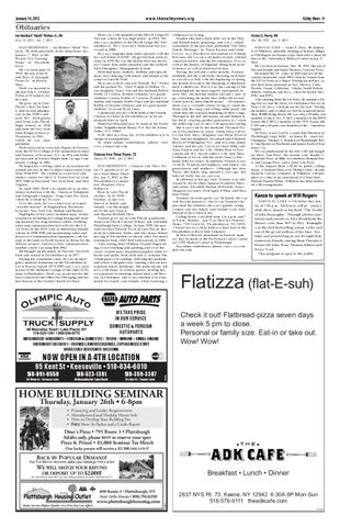 Herb was a life member of the F&AM Lodge 83, Newark, where he was high priest. in 1955. He also was a member of the F&AM Lodge 602, Elizabethtown. He r eceived a Dedicated Service Award in 1988. He was a longtime ham radio operator with the low-call letters W2TDD. He got his ham radio license in 1939. He was the liaison between the Essex County ham radio operators and the New York State Emergency Management System. Herb had many outdoor hobbies and enjoyed many days relaxing with family and friends at his camp on Lincoln Pond. He is survived by one son, Ronald “R.J.” Potter and his partner Dr . Alice W right of Milton, Vt.; one daughter, Nancy Lee and her husband Robert Dobbs of V ictoria, British Columbia; two grandchildren, C urran D obbs o f V ictoria, B ritish C olumbia and Ananda Dobbs Umar and her husband Bobbie of Toronto, Ontario; and two great grandchildren, Nyal and Ryah Umar. A memorial service will be held at the United Church of Christ in Elizabethtown, to be announced later in April. Memorial donations may be made to the Keene Valley Neighbor hood House, P.O. Box 46, Keene Valley, N.Y. 12943. W.M. Marvin’s Sons, Inc. of Elizabethtown is in charge of arrangements. To send online condolences, please visit www.wmmarvins.com.