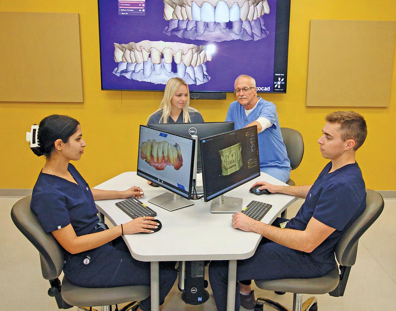 Faculty member Dr. Dennis Fasbinder (left), director of the new Digital Dentistry Center, works with three students, from left, Carmen Katje (D4), Zahra Husain (D4) and Sawyer Watterson (D3) at a computer station in the DDC. In the background is part-time lab technician Gary Mora and at far right is Trent Dobbs, the DDC’s full-time lab technician.