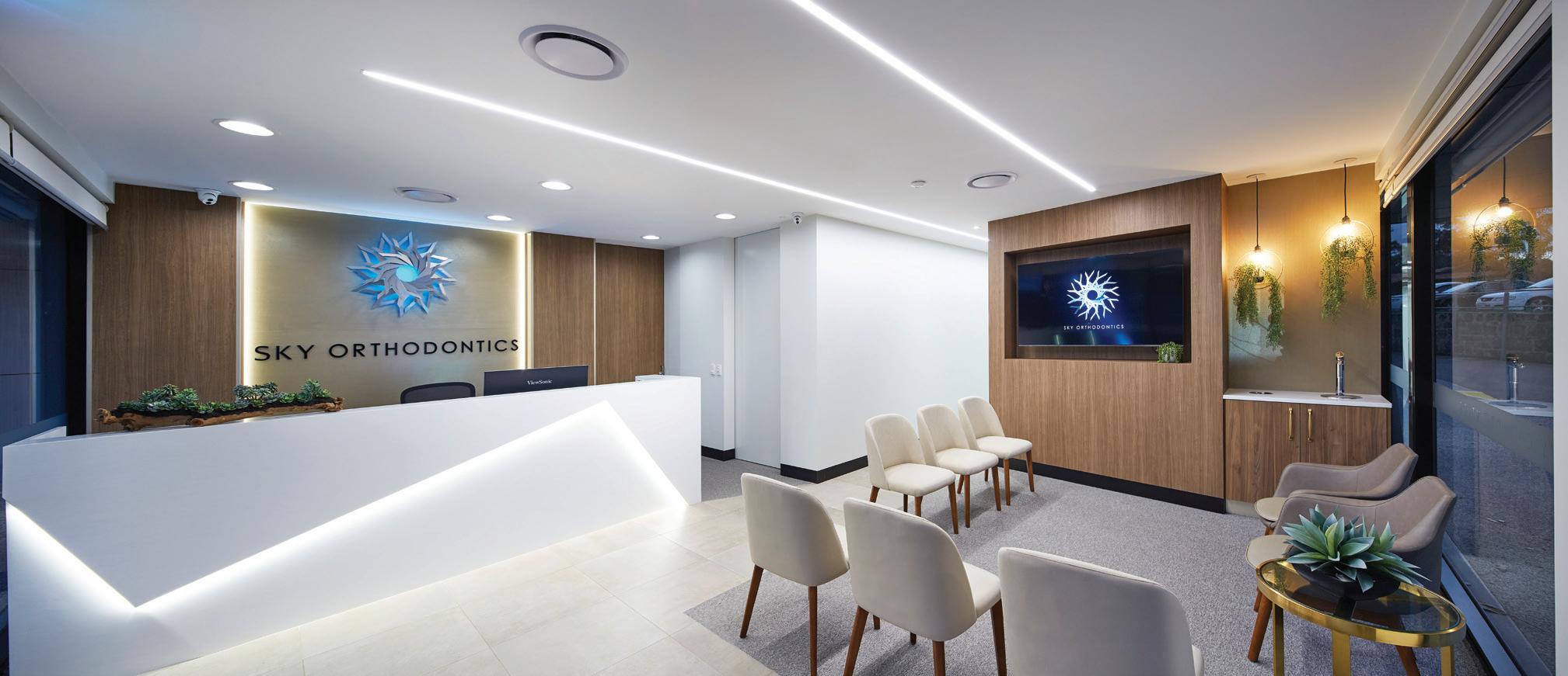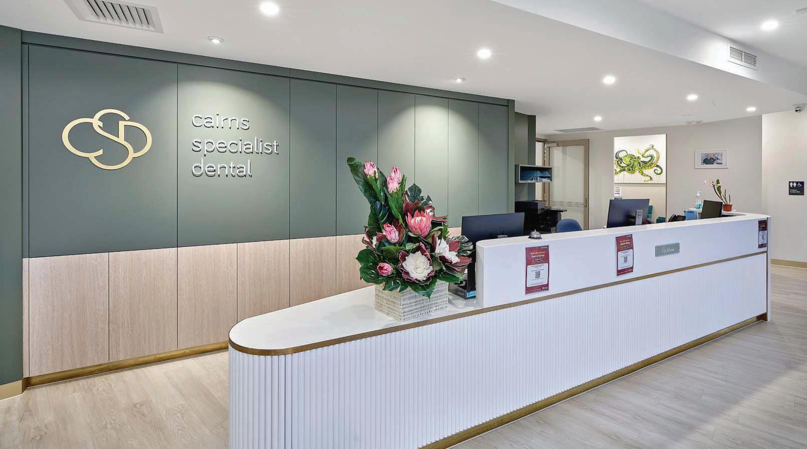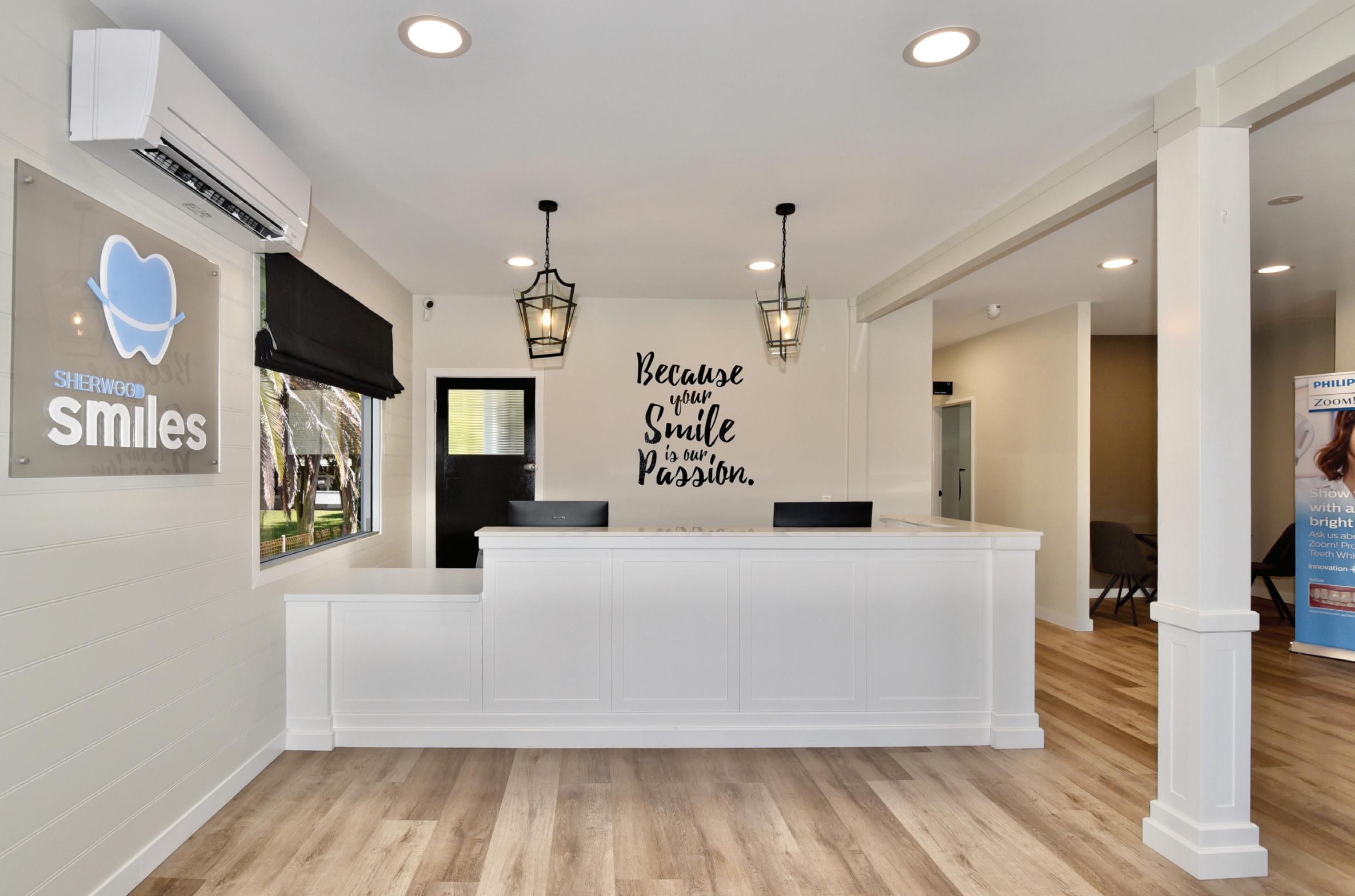 marble topped reception desk and walls adorned with Sherwood Smiles signage and slogan - “Your smile is our passion” - reassuring patients.
