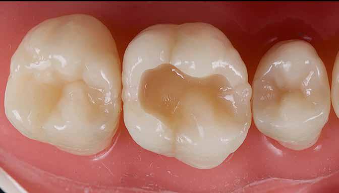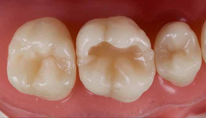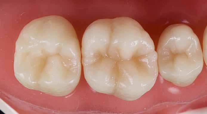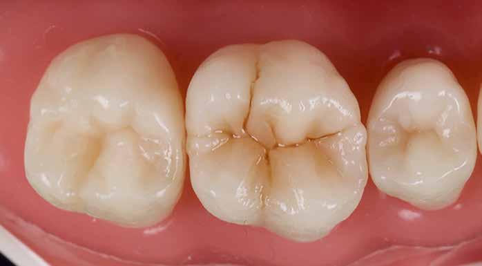4. A szerző egy dinamikusabb, funkcióalapú megközelítést javasol a rágófelszíni anatómia kialakítására, a DeVreugd-féle okklúziós iránytű iránymutatásait követve. Ezzel a módszerrel a végső rétegezés után vagy egyáltalán nincs szükség korrekcióra, vagy – gyakoribb esetben – csak minimális beavatkozás szükséges; így az eredmény egy esztétikusabb, gyorsabban elkészíthető és könnyebben polírozható restauráció.