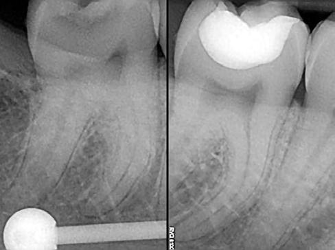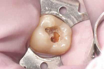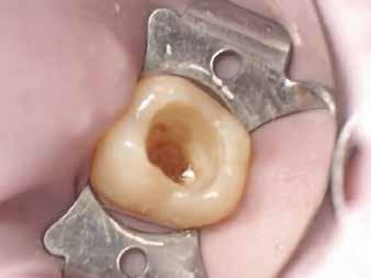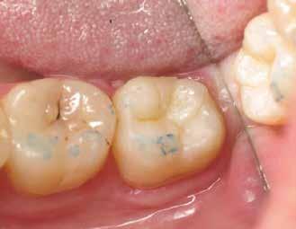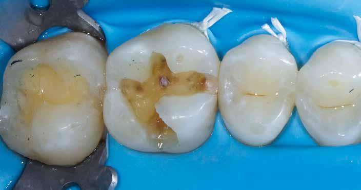 Az 53 éves hölgy páciens jobb felső 6-os fogában látható amalgámtömés cseréje volt a cél. A tömés mellett secunder caries és az amalgám következtében létrejött mesialis zárólécen áthaladó repedés, továbbá mesialis caries figyelhető meg (1. ábra). El kellett kerülni, hogy a tömés kifúrásakor az amalgámtörmelék a páciens szájába kerüljön, esetleg ebből valamennyit lenyeljen, a kezelés első lépésként kofferdám izoláció került fel a jobb felső kvadránsba (2. ábra). A kapocs a 1.7 fogra került, ezzel kényelmesen helyet teremtett a későbbiekben felkerülő matricarendszernek. Az egyszerre több fog izolálása lehetővé teszi, hogy a szomszédos fogak referenciául szolgáljanak a restauráció felépítése közben.