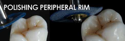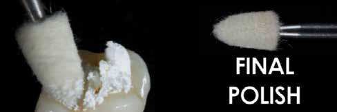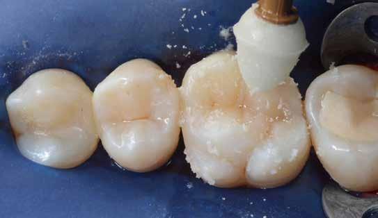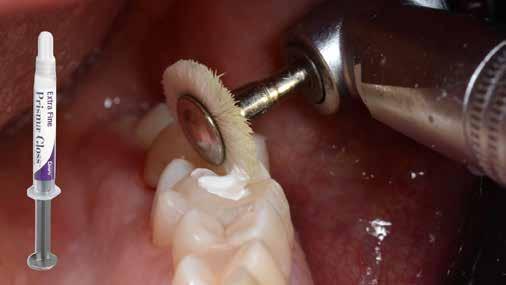 A kofferdam eltávolítását követően kerülhetett sor az occlusio beállítására csücsöklejtők domborúságának a redukciója révén (13. ábra). A harapás gyémántfúrókkal történő beállítása után a polírozás Enhance rendszerrel történt, melynek végső lépéseként a PrismaGloss használatával (14. ábra) nyerhette el a restauráció a végső fényességét (15. ábra)