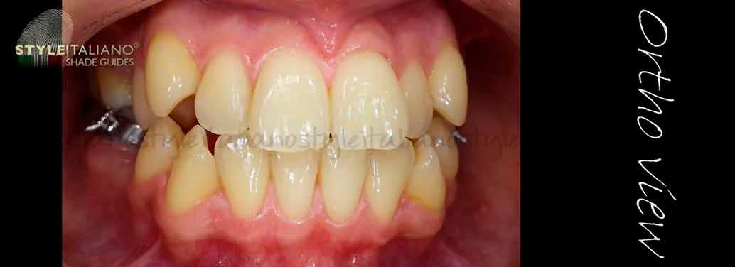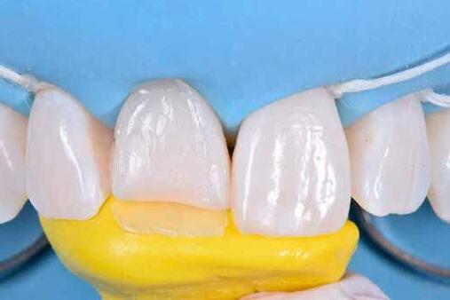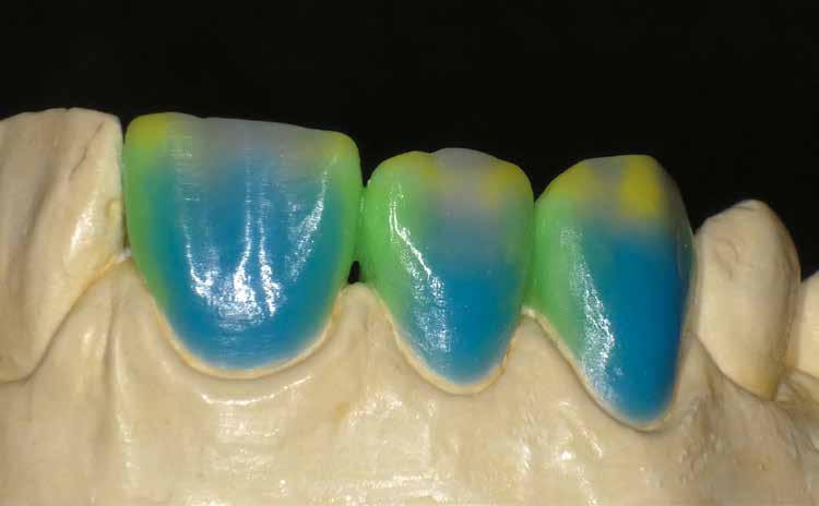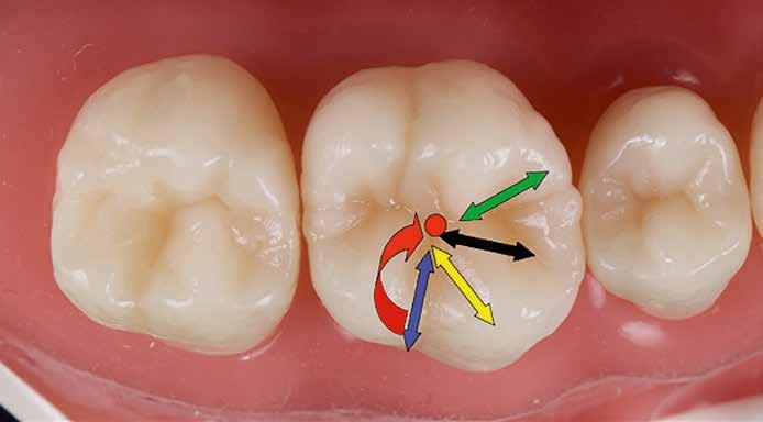 A mesio-bukkális háromszöget és a marginális gerincet az adott VITA árnyalatnak megfelelő, alacsony opacitású kompozitból alakítja ki. Ezzel egyidejűleg kialakul a középső bukkális barázda (kék - laterotruzív irány) és a másodlagos mesio-bukkális anatómia (sárga - lateroprotruzív irány).