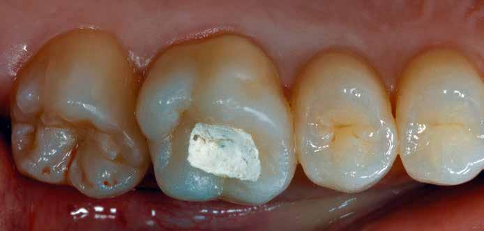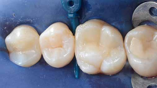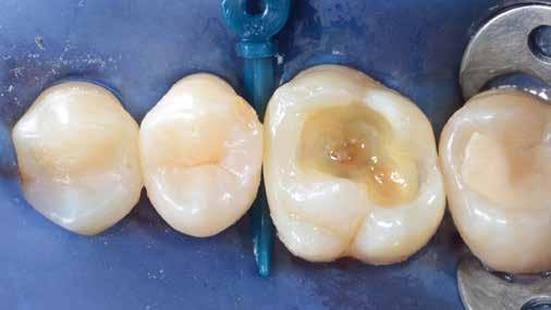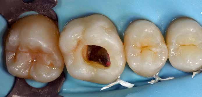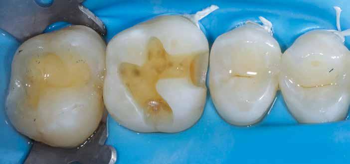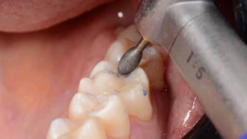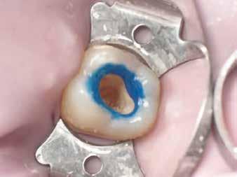 A régi amalgámtömés eltávolítását követően caries indikátor segítette a carieses laesio megfelelő kitisztítását a pulpa expozíciója nélkül. Ezután kerülhetett sor az ideális üregdesign kialakítására, továbbá a zománcszélek finírozására (3. ábra) Az approximális box megnyitása során az alátámasztatlan zománcprizmák eltávolításra kerültek, ezzel is csökkentve a secunder caries képződés veszélyét. Az így kialakuló forma elősegíti a matrica megfelelő adaptációját, végül pedig az approximális box határainak a hozzáférhetőségét, így finírozás során ez jobban kontrollálható és polírozható.