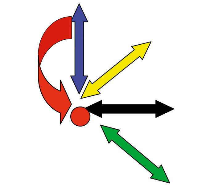 • LATEROPROTRUSIO (sárga) – kifelé és előre irányuló mozgás kombinációja;