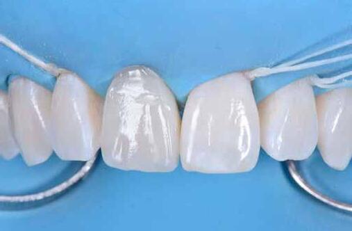 A restauráció megfelelő polimerizációja után célszerű a kofferdám nyújtotta retrakciót kihasználni, és a restauráció széli záródásában levő esetleges kompozitfölösleg elfinírozását jobb rálátás mellett elvégezni (9. ábra). Ebben nagy segítségünkre lehet az Enhance rendszer, mely a kompozitot nagyon szépen elsimítja, de a természetes fogszövetet nem bántja.