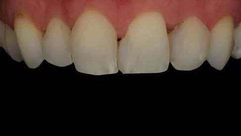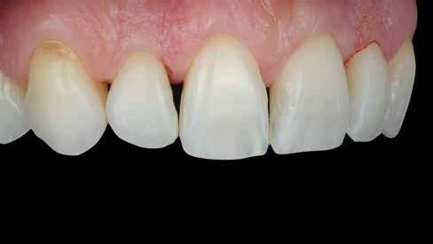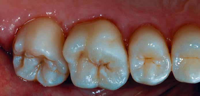 2. Az okkluzális korrekció gyakran a fontos anatómiai részletek elvesztéséhez vezet: a konvex csücskök homorúvá válnak, a barázdák és mélyedések eltűnnek, a zománcrétegként felhelyezett kompozitot lecsiszoljuk, és a dentin-kompozit a felszínre kerül. Az eredmény pedig esztétikailag kedvezőtlen: gyakran egy formátlan, szürkés kompozit tömeg marad vissza.