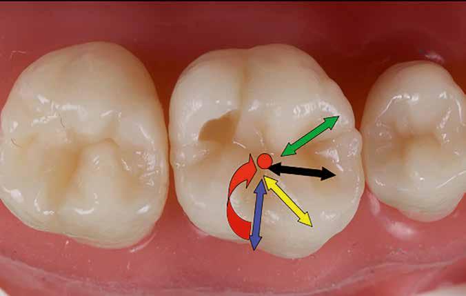 Az iránytű középpontja (az IKP-ben létrejövő érintkezés) körül található egy kisebb szabad zóna, amely lehetővé teszi az antagonista csücsök mozgását a „hosszú centrikus” (Long Centric vagy Freedom in Centric) tartományban [10]. Ez képezi a Polz-féle biomechanikai wax-up [11] alapját, amelyre a DeVreugd-féle okkluzális iránytű is épül. Jelen publikáció célja egy dinamikus alapú, ésszerű megközelítés bemutatása a hátsó fogak direkt kompozittal történő restaurálásához, amelynek eredményeként a rétegezést követően csupán minimális utólagos korrekcióra van szükség. A szerző a rövidebb, lényegre törő bemutatás kedvéért a felső első molárisra fókuszál. Ezt a fogat azért választotta, mert rágás közben ez viseli a legnagyobb erőbehatást, és ezen a fogon található a legtöbb okklúziós érintkezési pont [9].