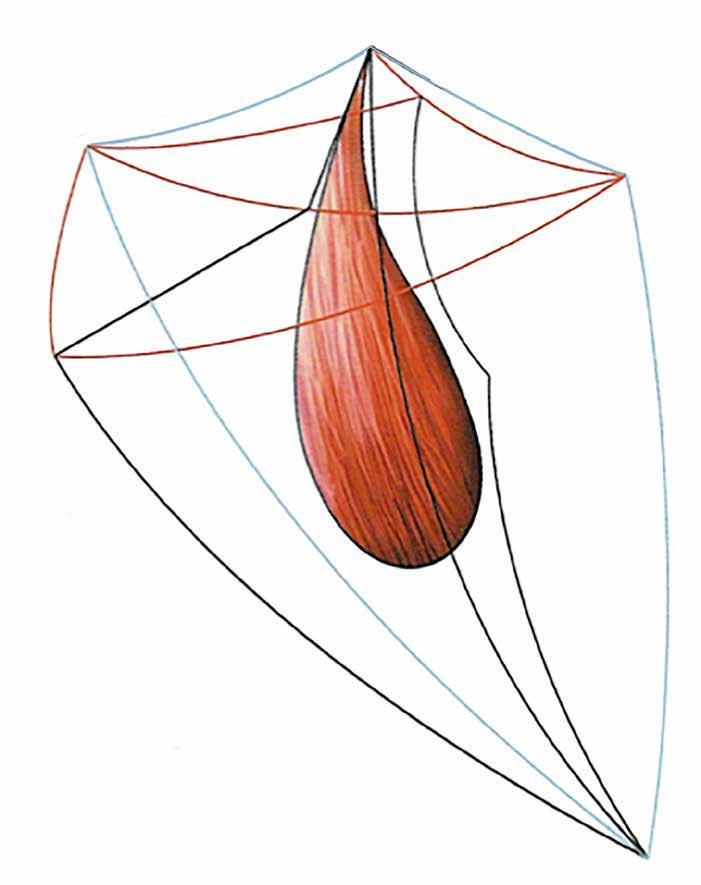 9. ábra: Az okklúziós iránytű központjának okkluzo-apikális helyzete az összetérő csücsöklejtők találkozásánál.