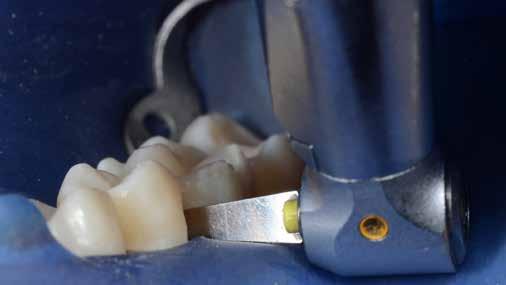 A matricázott terület széli záródásának a kidolgozásában az EVA polírozó (10. ábra) lehet a segítségünkre, amellyel a gingiva sérülése megelőzhető, és a kialakított feszes kontaktpont sem kerül redukcióra (11-12. ábra)