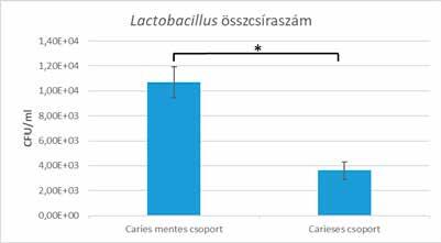 zatú gyermekekhez képest. Viszont a Lactobacillusok összcsíraszáma a carieses gyermekek csoportjában szignifikánsan alacsonyabb volt a cariesmentes csoporthoz képest (2. ábra) A cariesmentes gyermekek csoportjában az L. plantarum, L. fermentum fajok fordultak elő legnagyobb menynyiségben, míg a carieses csoportban az L. salivarius előfordulása dominált leginkább.